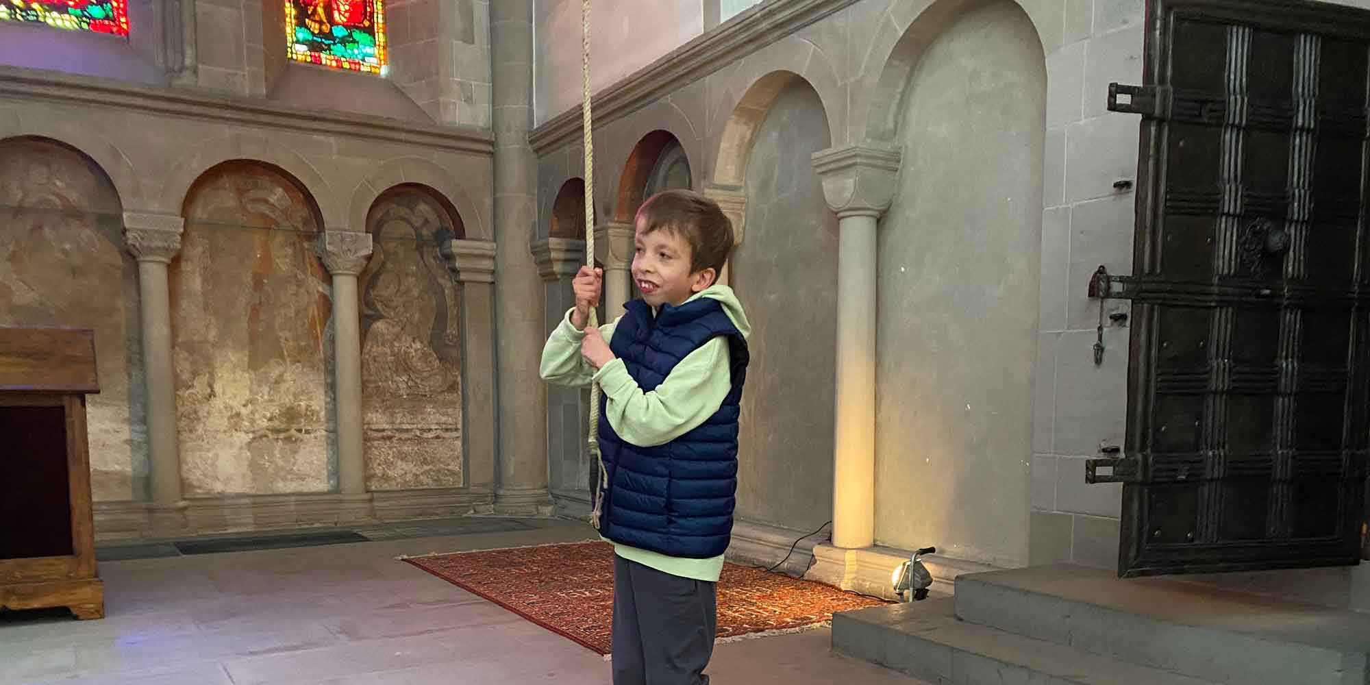 Nous avons réalisé le Rêve de Julien grâce au sacristain du Grossmünster: Francesco Gargiulo qui a emmené Julien dans le chœur de l’église, où pend la corde de la cloche de prière. À 11h précises chaque matin, cette cloche est sonnée pendant cinq minutes, à la main – et ce jour-là, c’est Julien qui a eu le privilège d’assumer cette grande responsabilité. Quelle ardeur il a mise à la tâche! Puisque la petite cloche se trouve bien haut dans la tour pointue et rouge du Grossmünster, on ne la voit pas du chœur. Mais comme la porte de la tour était ouverte, Julien l’a très bien entendue.